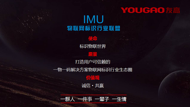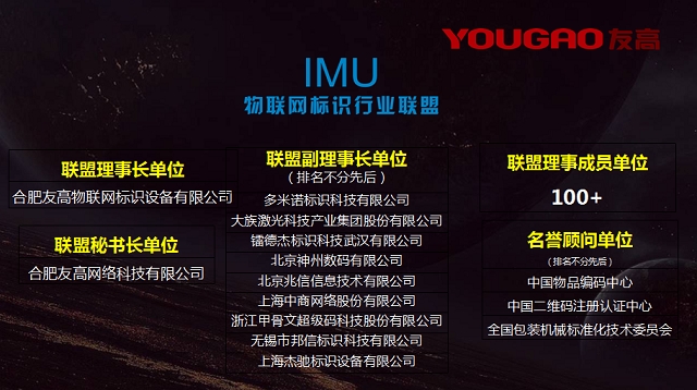 在總經(jīng)理陳文正先生的帶領(lǐng)下,友高公司不僅注重自身品牌的升級發(fā)展,更注重行業(yè)的可持續(xù)進(jìn)步,IMU物聯(lián)網(wǎng)標(biāo)識行業(yè)聯(lián)盟正是基于此而成立,友高作為IMU聯(lián)盟的理事長單位和秘書長單位,始終堅持以“誠信·共贏”為核心價值觀,最大限度發(fā)揮IMU聯(lián)盟的資源與價值,為成員單位及行業(yè)發(fā)展做貢獻(xiàn),以完善的一物一碼產(chǎn)業(yè)鏈體系為各行各業(yè)提供最合適的一物一碼解決方案,為制造企業(yè)產(chǎn)業(yè)升級,為智能化未來提供助力。