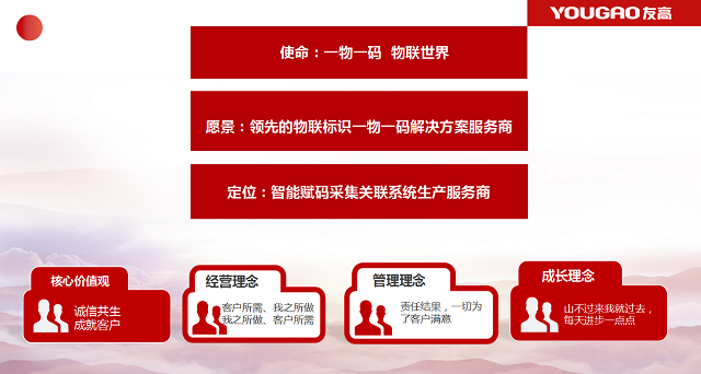 在眾力眾智之下,友高有信心在五年內(nèi)成為國內(nèi)物聯(lián)網(wǎng)標(biāo)識(shí)行業(yè)標(biāo)桿企業(yè),成為智能賦碼檢測(cè)采集關(guān)聯(lián)系統(tǒng)優(yōu)質(zhì)的生產(chǎn)服務(wù)商。