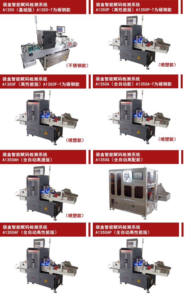 A1350智能賦碼檢測系統(tǒng)可為客戶提供多種需求的選擇,且在眾多客戶現(xiàn)場均有成熟的應(yīng)用案例,具體產(chǎn)品型號如下所示: